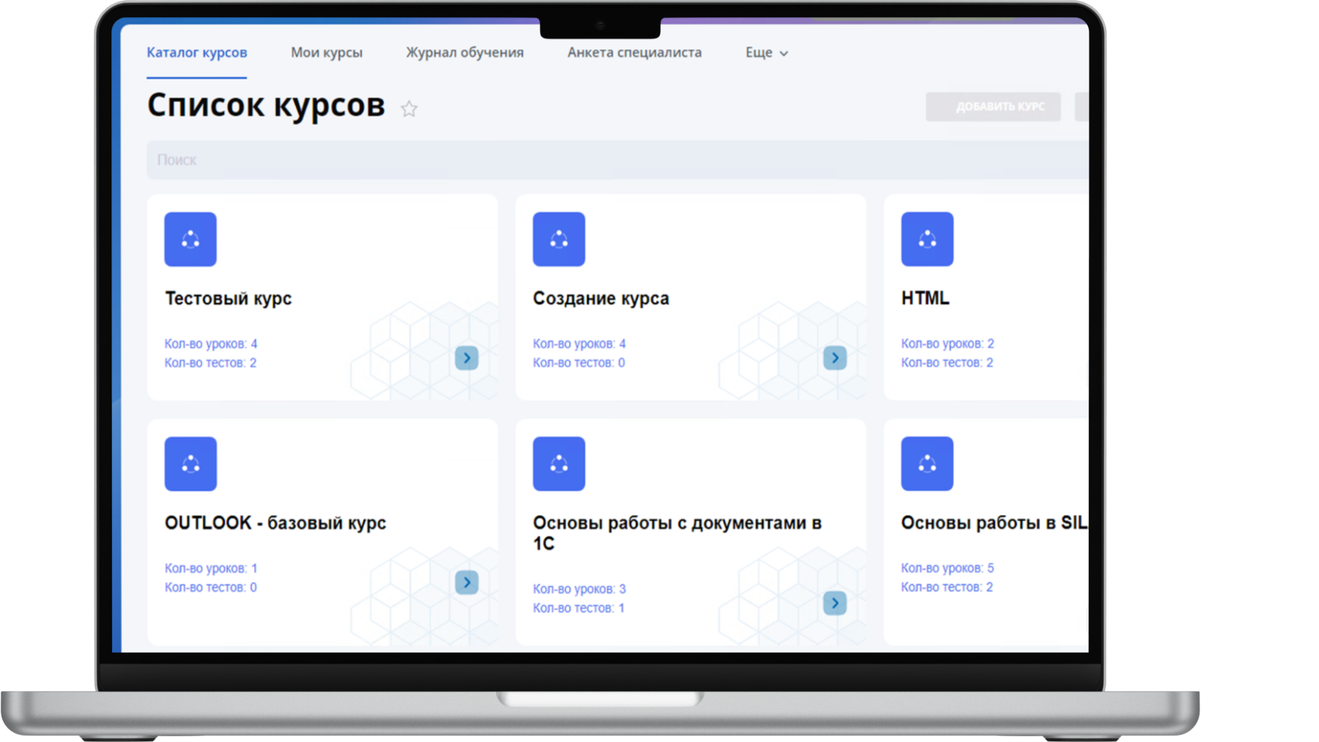 - Прохождение уже созданных курсов, вопросов для самопроверки и итоговых тестов внутренними и внешними (Экстранет) пользователям